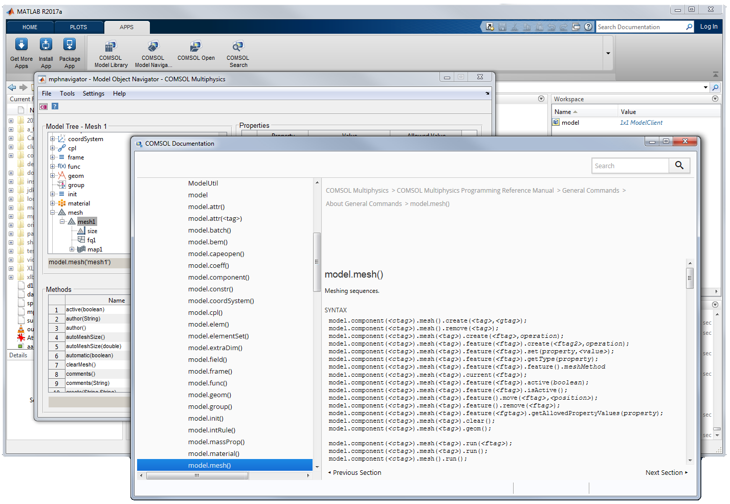 The mphdoc function allows you to access the COMSOL documentation. You can now receive help for all nodes in the model object tree, as well as for all wrapper functions that come with LiveLink™ for MATLAB®. Additionally, you can open the COMSOL® API for use with Java® documentation, which gives detailed information about all of the classes and methods available for controlling COMSOL® models from the MATLAB® software. A general documentation window can be opened that gives access to the entire set of COMSOL documentation, which you can search and browse through. Access to the help documentation is added to mphnavigator to help you find the right documentation pages.